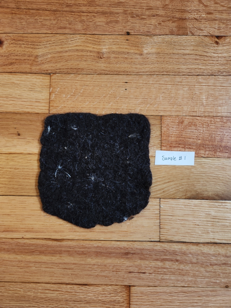 While I don’t know much about hat felt, I do have some basic experience with wet felting, so I did several tests. I used a squeeze bottle of warm water mixed with just a few drops of dish soap to wet the fiber. I rubbed it with my hands until I had a shape that held together and then sandwiched the felt piece between sheets of bubble wrap to roll on the countertop. Because my samples were small, the felting process didn’t take very long. I made each sample one at a time, but I tried to use the same amount of water, friction, and time for each piece, relative to size.