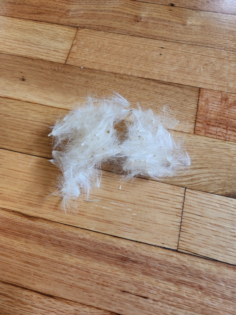 Seufferlein notes in a footnote that thistle wool refers to Cirsium vulgare or any other wooly thistle variety. Near my home in Colorado, plenty of invasive Canadian thistle grows in open spaces, providing just what I needed to make my own thistle felt. I kept an eye on the thistles, and when they looked ready to burst, I chose a hot, dry evening to harvest. I reached into the heads of the flowers and pulled out just the fluff, rather than taking the whole seed head. I stuffed a quart-sized ziplock bag in ten minutes. The original source didn’t mention whether the seeds were removed from the fluff, but I went ahead and separated them. That process took me about an hour, which was faster than I expected. Removing the seeds also allows me the choice to compost my felt pieces in the future without replanting the thistles. The last thing I want to do is help propagate an invasive species.