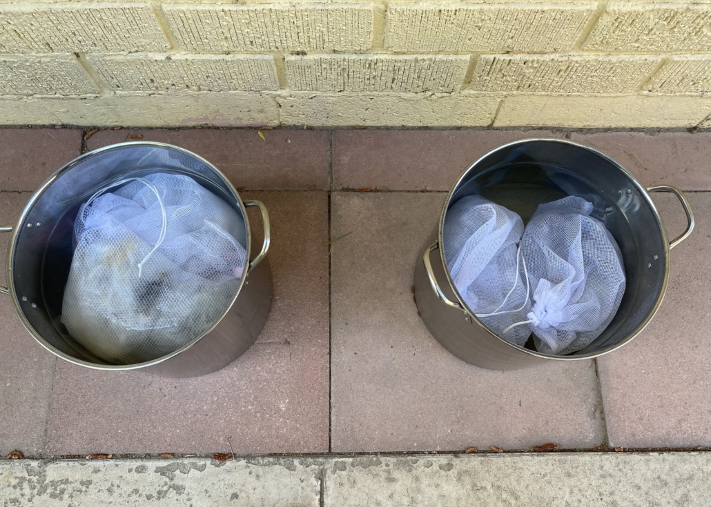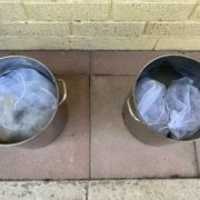 The next morning, as the sun rose, I set myself to scouring. I hauled hot water from the kitchen sink out to the patio. I added what I hoped was the right amount of Unicorn Power Scour. I felt like a sailor trying to navigate by the stars after reading a couple pages on the internet. Would I felt the wool? Would I get it clean enough? Would I manage to comb it after it dried? What the heck was I doing?!